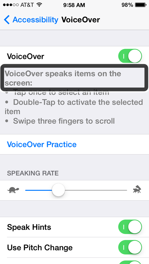 Practice VoiceOver gestures. Go to Settings > General > Accessibility > VoiceOver, then tap VoiceOver Practice. When you finish practicing, tap Done. If you don’t see the VoiceOver Practice button, make sure VoiceOver is turned on.